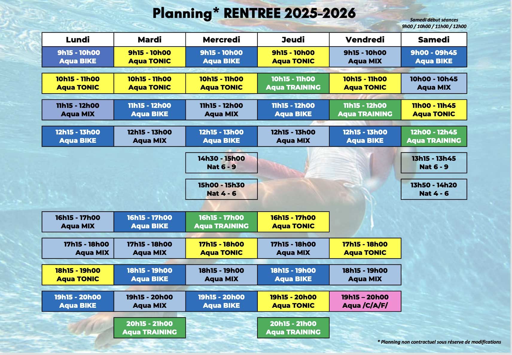 Un cours complet combinant aquabike et aquagym pour alterner cardio et renforcement musculaire. Parfait pour celles et ceux qui veulent diversifier leurs entraînements en une seule séance.